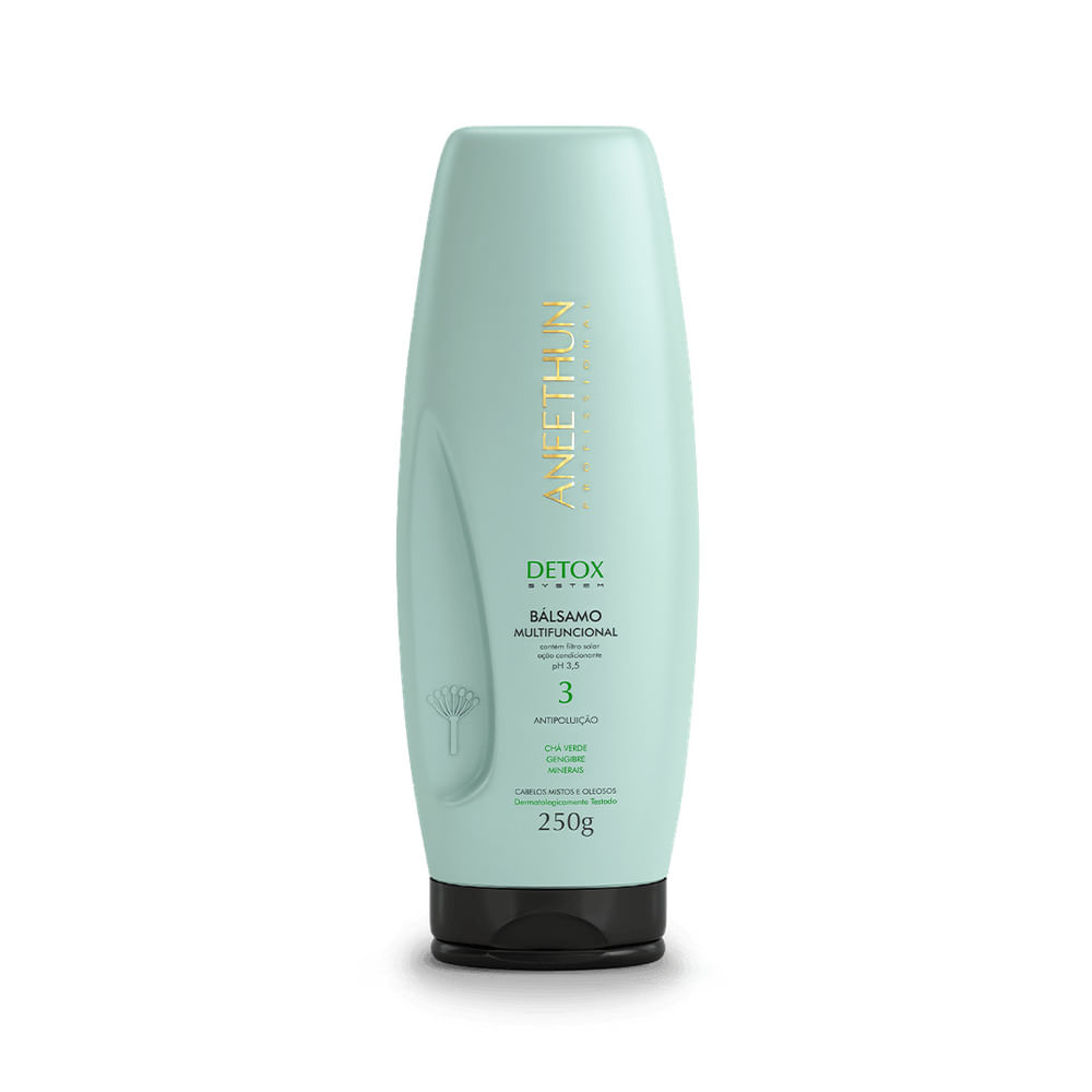 O Bálsamo Multifuncional Detox System possui fórmula multifuncional, com ou sem enxágue, que forma uma película antipoluição. Promove nutrição, condicionamento e hidratação sem pesar os fios, deixando-os leves e macios. pH 3,5.